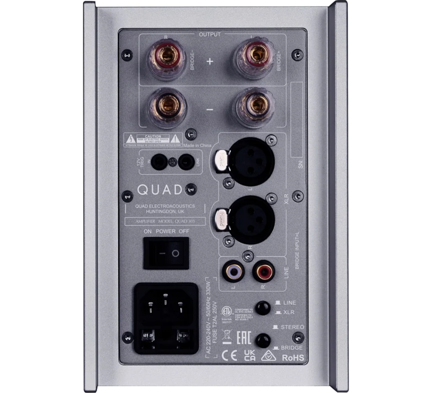 Le panneau arrière a été entièrement modernisé. Le 303 offre au choix une connexion XLR symétrique ou RCA asymétrique vers le préamplificateur, deux paires de borniers d'enceintes multi-formats et une prise IEC avec interrupteur secteur. On trouve également des entrées et sorties trigger 12 volts pour synchroniser la mise en veille avec un préampli compatible comme le QUAD 33 ou un second 303 en configuration bridgée.