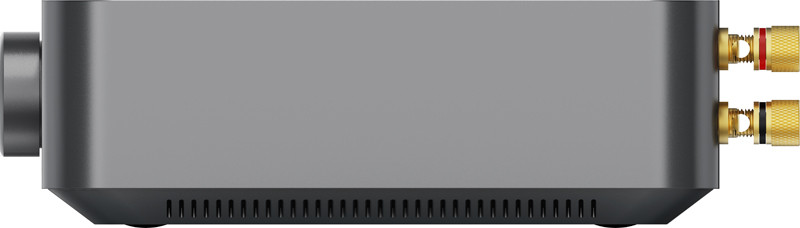 En sortie, il dispose de borniers pour enceintes passives et d'une sortie dédiée pour un subwoofer, permettant ainsi une configuration stéréo ou 2.1 avec des basses optimisées.