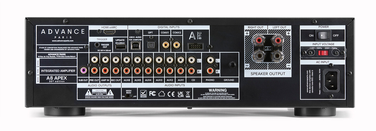 Enfin, les sorties Pre-Out, Rec-Out et Sub-Out autorisent l'ajout d'un bloc de puissance externe, d'un enregistreur ou d'un caisson de basses. L'entrée Amp-In, elle, permet d'utiliser le A8 APEX uniquement comme bloc de puissance au sein d'un système home-cinéma, en bénéficiant de sa qualité sonore sur les voies avant.