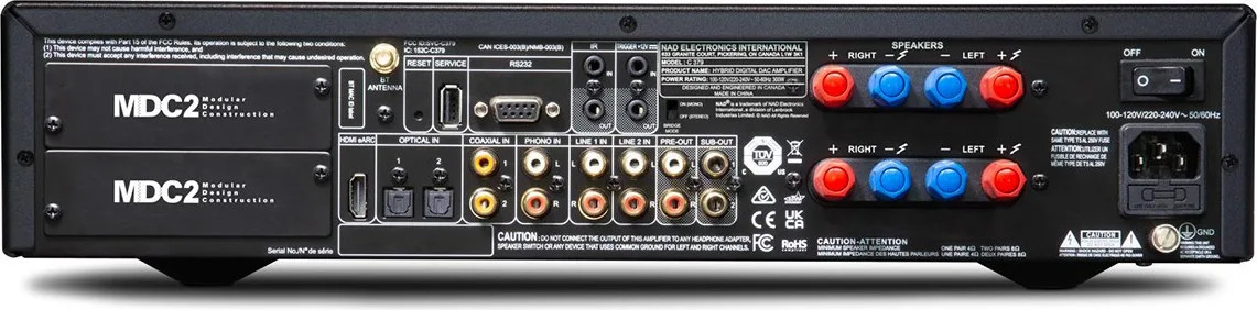C'est l'une des signatures de NAD depuis 2006 : le concept Modular Design Construction. Le C379 intègre la deuxième génération (MDC2) avec deux emplacements d'extension à l'arrière. L'intérêt est double : d'abord éviter l'obsolescence rapide en permettant d'ajouter de nouvelles fonctions plus tard, ensuite personnaliser l'appareil selon vos besoins réels.