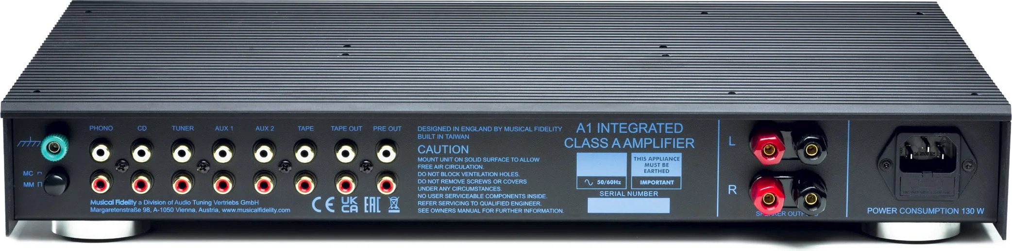 Le A1 est construit autour d'une topologie Class A entièrement discrète et symétrique et délivre 25 W par canal sous 8 ohms, avec un courant de sortie maximal de 25 A. L'amplificateur fonctionne en Class A dynamique : si le courant de repos de classe A est dépassé, il autorise automatiquement plus de courant et glisse en douceur vers un fonctionnement de type Class B, permettant temporairement le tirage de courant supplémentaire nécessaire. Par rapport au modèle d'origine, cette version améliore la puissance de sortie, la capacité à piloter des enceintes et la résolution des détails fins.