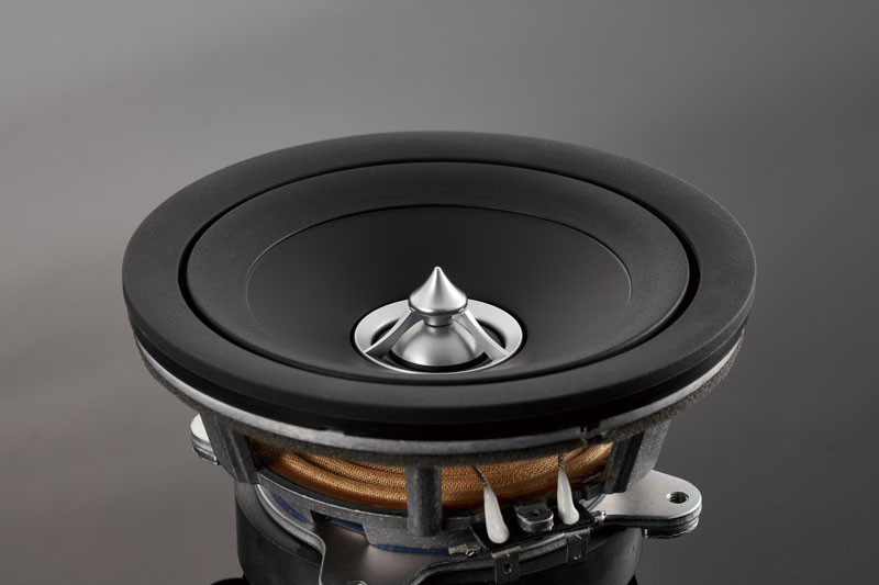 - Haut-parleur coaxial grave-médium de 165 mm à membrane en pulpe de cellulose avec traitement amortissant, support de bobine Kapton 38 mm et suspension périphérique DAR (Double Asymmetric Rubber).