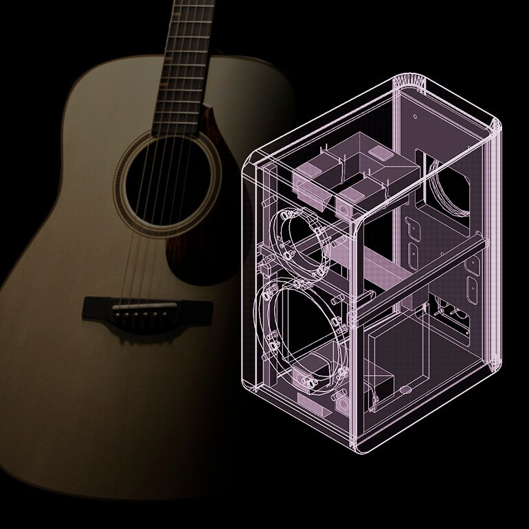 La construction du coffret de la NS-600A s'appuie sur des technologies de conception issues de la R&D instrumentale de Yamaha, avec l'utilisation de vibromètres laser et d'une analyse FEM (méthode des éléments finis). La traverse interne du coffret a été optimisée pour renforcer la localisation sonore et restituer fidèlement les nuances les plus délicates des instruments et de la voix. L'approche est littéralement celle d'un luthier : identifier où le coffret doit vibrer et où il doit rester silencieux.