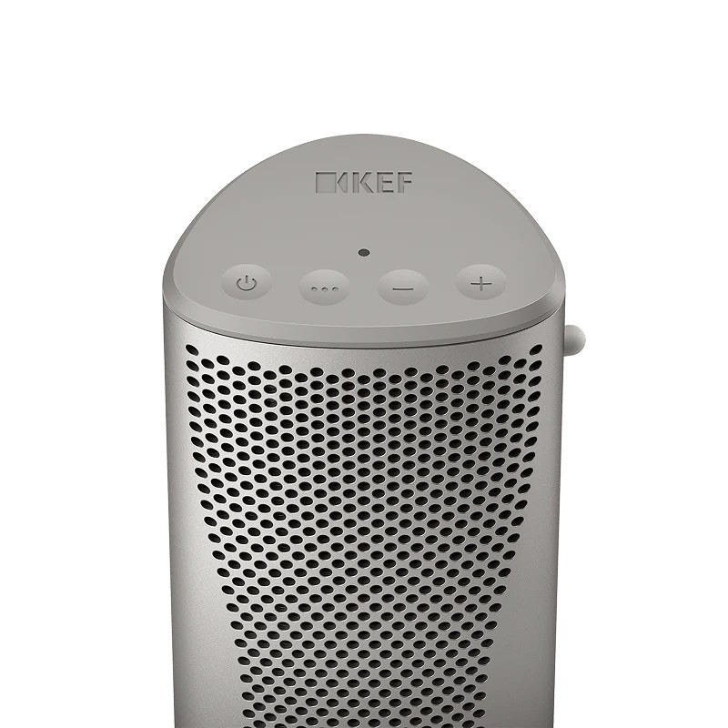 • KEF MUO enceinte Bluetooth argent, détail panneau supérieur boutons marche lecture et volume