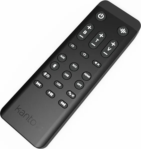L'installation reste simple : l'enceinte maîtresse accueille toutes les sources et se relie à l'enceinte passive par un câble haut-parleur fourni. La façade de l'enceinte active intègre un potentiomètre rotatif multifonction qui sert à allumer le système, changer de source et régler le volume. Une télécommande complète est fournie, avec des touches dédiées au grave, à l'aigu, aux modes sonores et à la sortie subwoofer. Un insert fileté 1/4"-20 sous chaque enceinte permet par ailleurs un montage sur pied ou au mur.