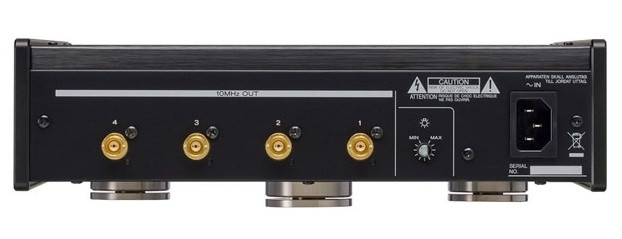C'est un fait bien connu chez les audiophiles : le signal d'horloge est la base de tout traitement de signal numérique. Les signaux numériques par exemple, comme le PCM, sont divisés extrêmement finement en dizaines de milliers de parties par seconde le long de l'axe temporel. Si cet axe temporel fondamental fluctue pendant le processus de conversion N/A, il est beaucoup plus difficile de rendre une forme d'onde audio analogique identique à l'original. Ceci est d'autant plus vrai avec les signaux audio DSD qui fonctionnent à des vitesses MHz sur l'axe temporel. C'est pour cela qu'il est très important de disposer d'un signal d'horloge aussi précis que possible pour la recréation de signaux audio numériques, en particulier les fichiers haute résolution qui mettent en œuvre des taux d'échantillonnage très élevés, de type DSD 22,5 MHz ou PCM 768 kHz. Au cœur du générateur d'horloge-maître se trouve un oscillateur à quartz, enfermé dans une boîte à température contrôlée, le « four », servant à maintenir la meilleure stabilité possible et les meilleures performances dans des conditions de température idéales pour l'oscillation du quartz. Cet oscillateur à quartz commandé par le four (OCXO en abrégé, de l'anglais « oven-controlled crystal oscillator ») génère un signal d'horloge extrêmement précis de 10 MHz qui se situe à ± 3 ppb des caractéristiques de température de fréquence et à ± 0,1 ppm de précision de fréquence. L'élégante jauge analogique sur le panneau avant donne une indication visuelle de l'état de l'oscillateur à quartz interne à tout moment.