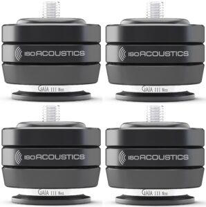 - Pieds d'isolation acoustique (jeu de 4) pour enceintes colonne et subwoofers jusqu'à 32 kg, utilisant la technologie de découplage brevetée IsoAcoustics pour réduire vibrations mécaniques et réflexions parasites.