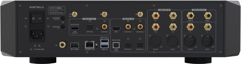 - Sorties analogiques XLR symétriques et RCA asymétriques ainsi que deux sorties subwoofer, entrées numériques complètes : USB-B, optique, coaxiale & ARC.