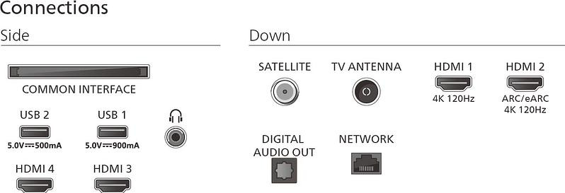 La section vidéo comprend 4 HDMI dont 2 ports HDMI 2.1 (48 Gbit/s) et 2 ports HDMI 2.0, avec eARC sur HDMI 2 et HDCP 2.3 sur tous. Deux USB complètent l’interface pour lecture/enregistrement multimédia. Côté réseau, Wi-Fi 6 (802.11ax 2x2) et Bluetooth 5.2 assurent débit et stabilité. Le triple tuner DVB-T/T2/T2-HD/C/S/S2, compatible HEVC, couvre la réception terrestre, câble et satellite.