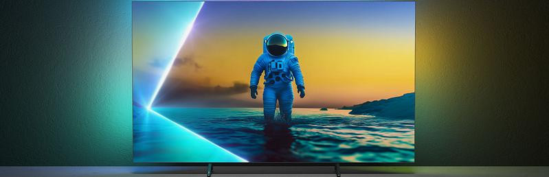 Les LED Ambilight synchronisées à l’image étendent visuellement la scène sur le mur. Au-delà de l’effet esthétique, l’augmentation du champ périphérique peut réduire la fatigue visuelle en visionnage sombre. Les modes Jeu, Musique et l’adaptation à la couleur du mur complètent le dispositif. L’effet reste volontairement paramétrable pour s’intégrer à différents environnements.