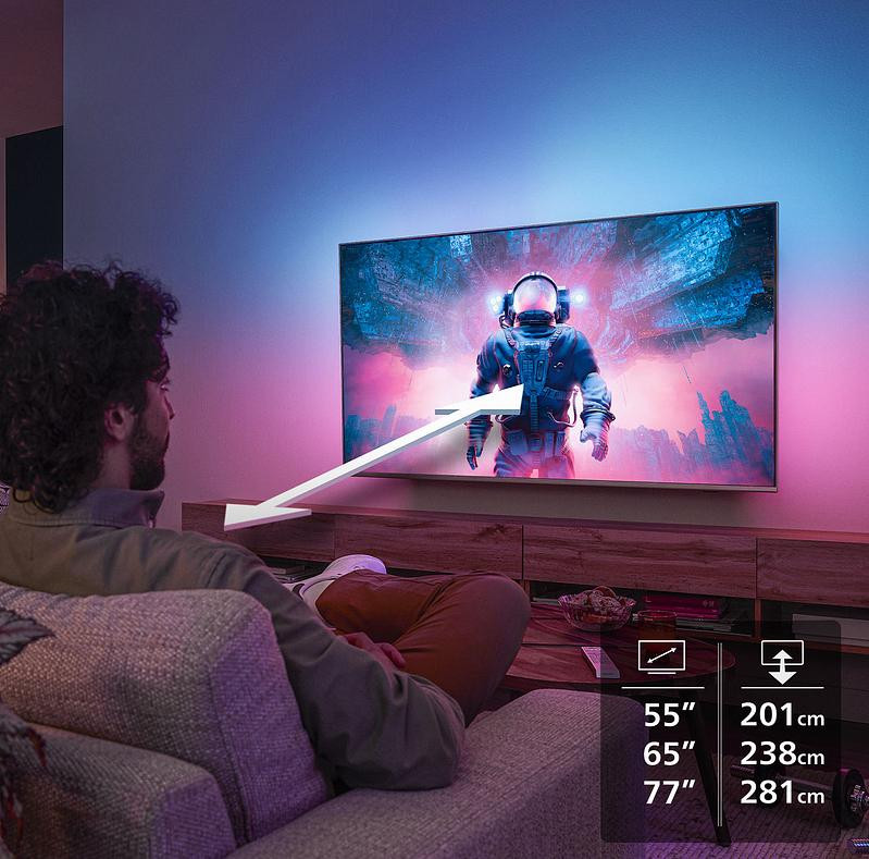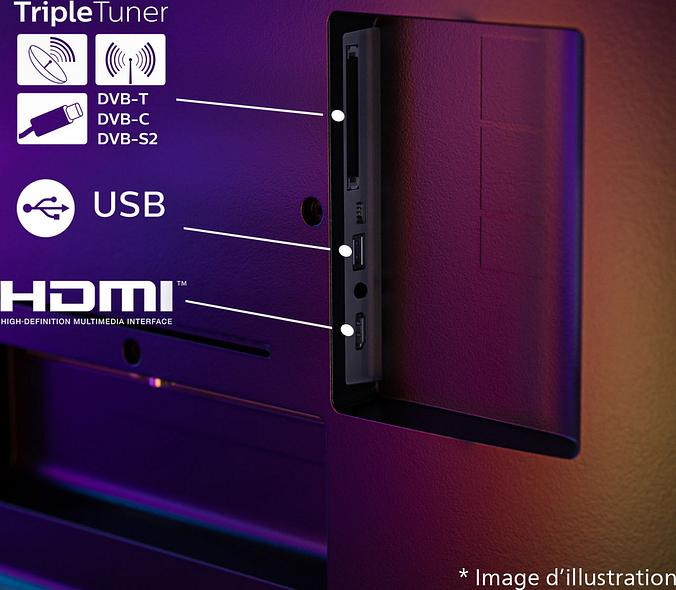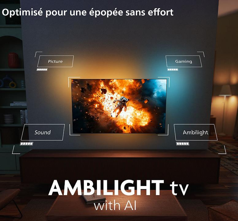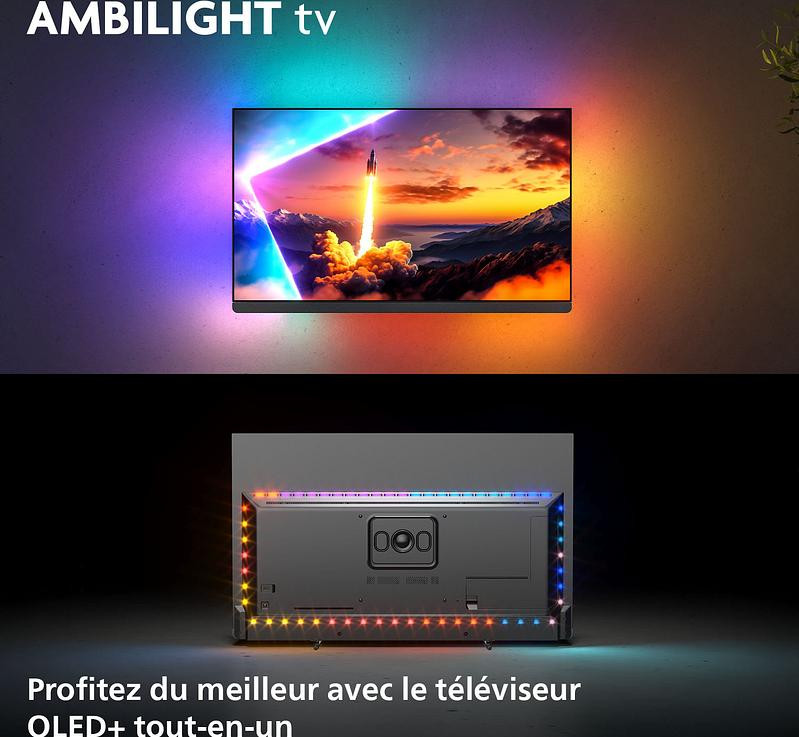 - Ambilight 4 côtés Next Gen : LED à spectre étendu synchronisées à l’image et à la musique pour une immersion visuelle totale.