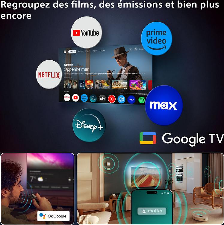 - Plateforme Google TV & compatibilité complète ; accédez à vos services de streaming préférés, au contrôle vocal et à la compatibilité avec Apple AirPlay, Alexa et Chromecast intégré.