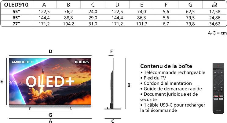 Le Philips 77OLED910 est un téléviseur OLED 4K de 77 pouces positionné dans le haut du catalogue 2025 du constructeur. Il associe une dalle OLED META (Primary RGB Tandem) très lumineuse, le processeur P5 AI Perfect Picture Engine, un Ambilight sur 4 côtés et une section audio Bowers & Wilkins en 3.1. L’objectif : combiner un rendu d’image fidèle et dynamique, une immersion périphérique propre à Philips, des prestations gaming modernes (4K120/144 Hz, VRR) et une expérience connectée Google TV aboutie. Cette analyse se veut impartiale : elle expose forces et points d’attention pour un lecteur averti.