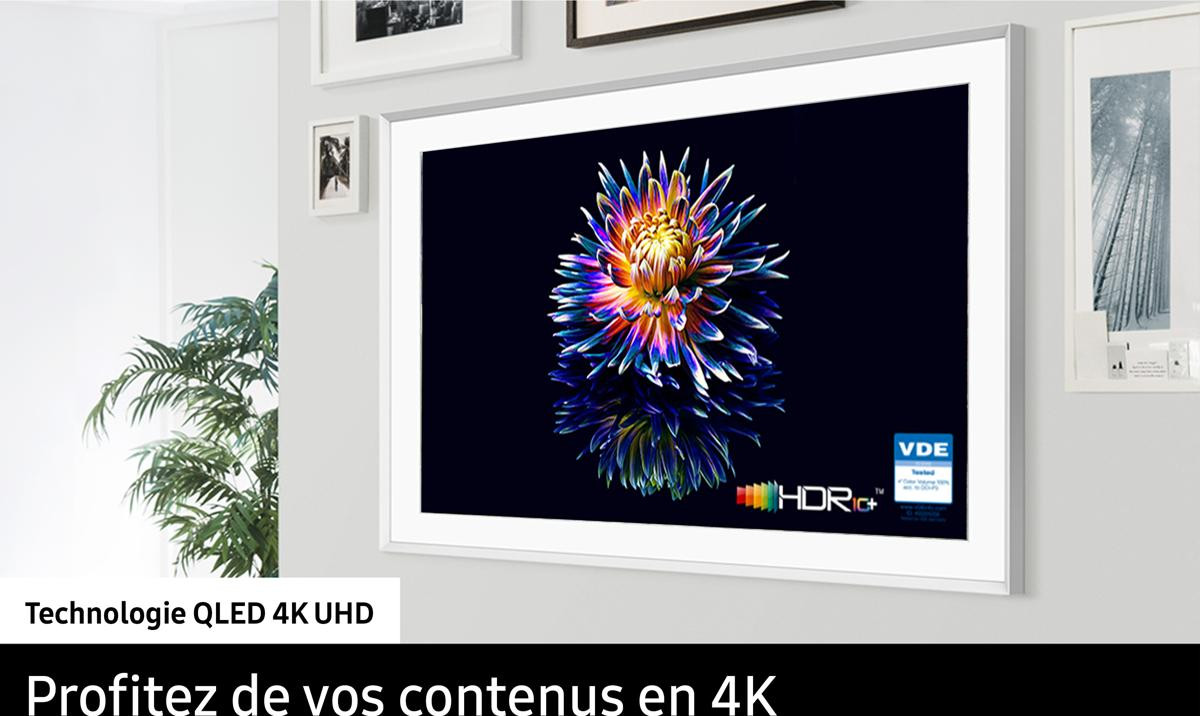 - The Frame 65LS03FA bénéficie de la technologie QLED 4K, qui garantit des couleurs riches et précises pour une image fidèle et immersive, que ce soit pour un film ou vos œuvres d’art.